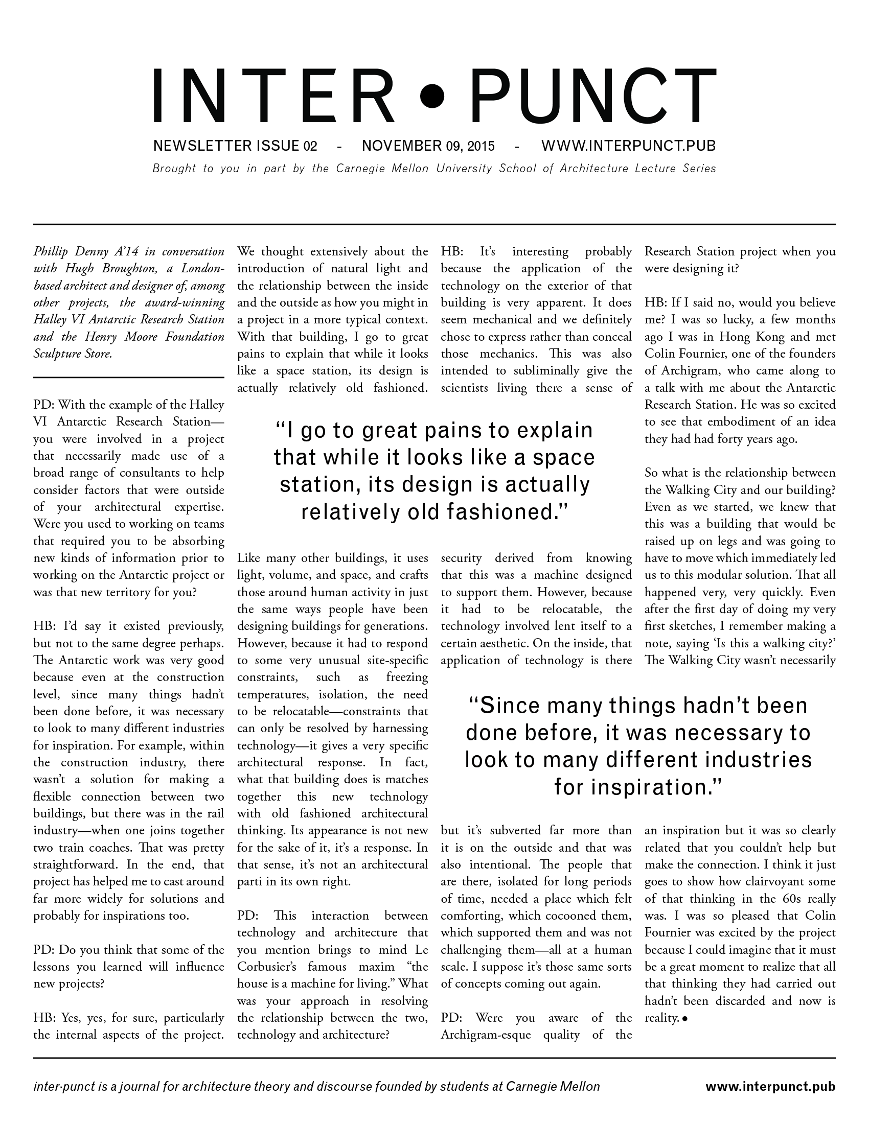 Phillip Denny A’14 in conversation with Hugh Broughton, a London-based architect and designer of, among other projects, the award-winning Halley VI Antarctic Research Station and the Henry Moore Foundation Sculpture Store.